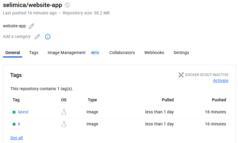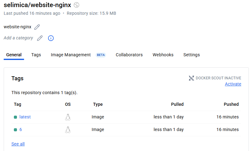 After Jenkins displayed success message, I checked DockerHub repos and saw each repo has its images. Everytime I run this Jenkins pipeline, it will build and push a new image to each repo with the new build number and it overwrites the latest tagged image.