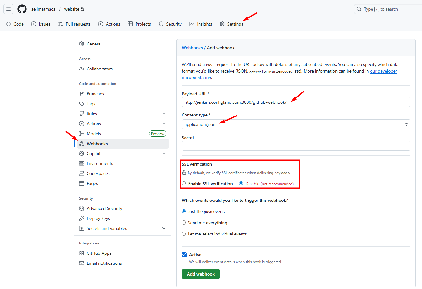 I did not configure https communication for jenkins, if you run jenkins over https, you can select SSL verification. For production setups, always use HTTPS to protect credentials and webhook payloads.