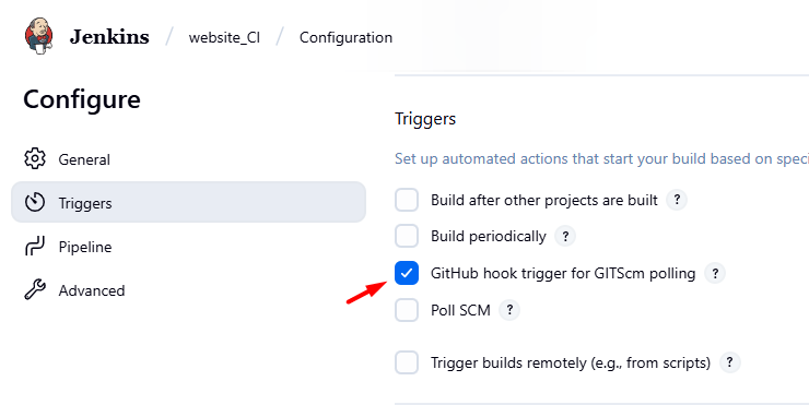 Now go back to your Jenkins server and choose the jenkins job > Configure > Scroll down to "Build Triggers" > Check "GitHub hook trigger for GITScm polling" and Save.