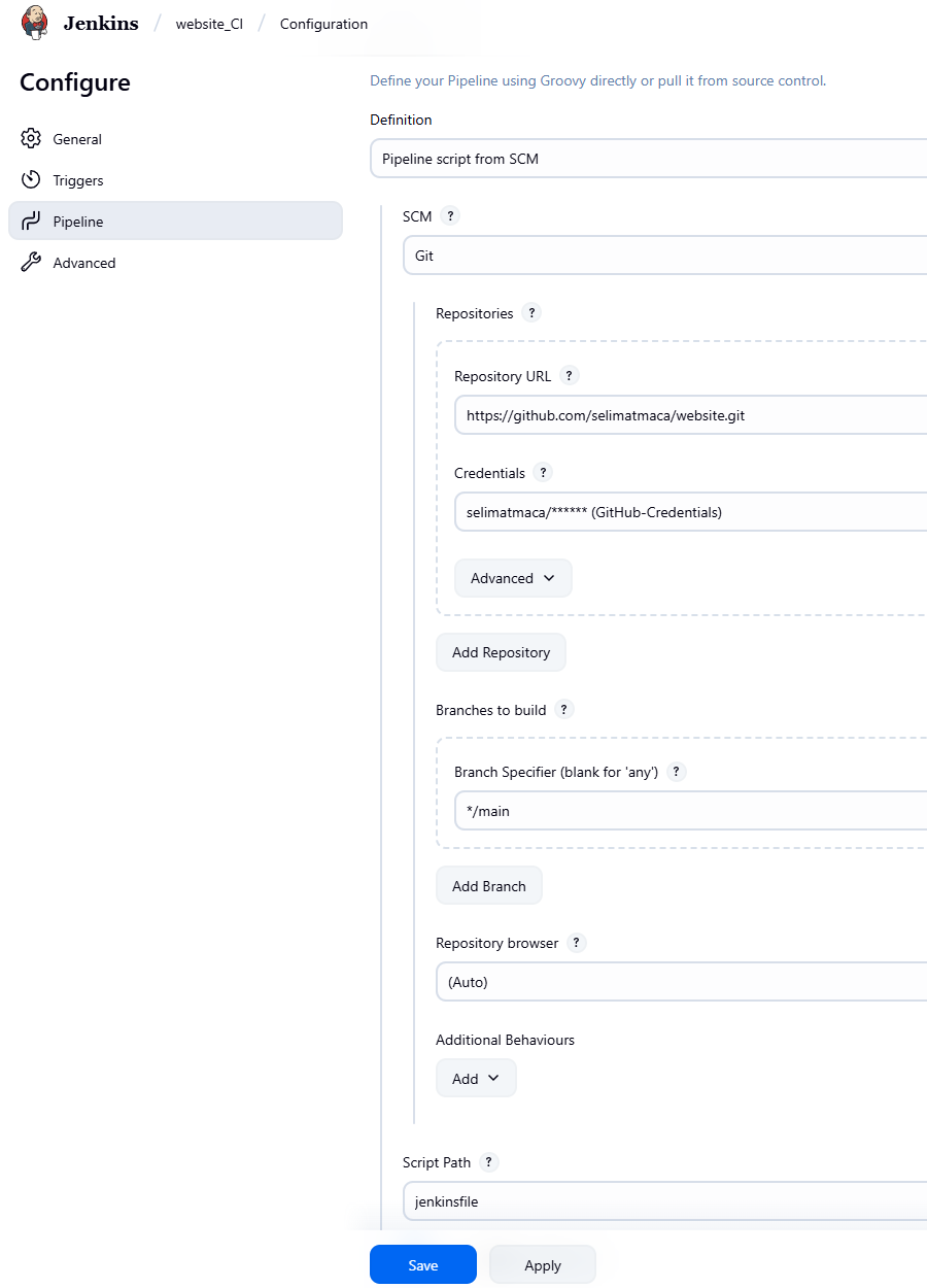 credentialsId: 'GitHub': refers to the Jenkins credential entry that contains your GitHub username and Personal Access Token (PAT).