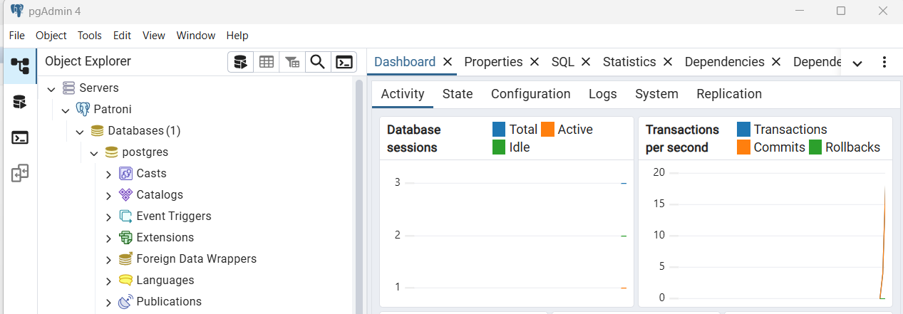 We add Virtual IP as the host address. The password is the one that we defined in /etc/patroni/config.yml file.