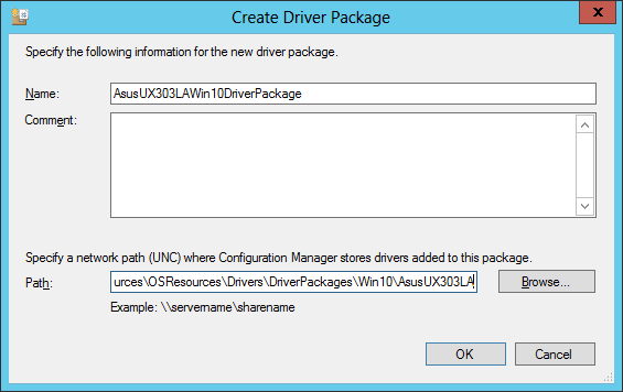 Enter a descriptive name fort he driverpackage and browse the UNC path of the driverpackage folder