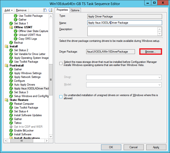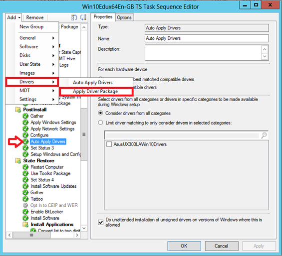 Auto Apply Drivers task sequence step allows Configuration Manager 2012 to search for the appropriate device drivers from driver categories. On the other hand Apply Driver Package task sequence step allow Configuration Manager 2012 to install only device drivers from a specific category. We will first add Apply Driver Package task sequence step and then disable the existing Auto Apply Drivers task sequence step. Typically, the Apply Driver Package task sequence step is placed after the Auto Apply Drivers task sequence step.
