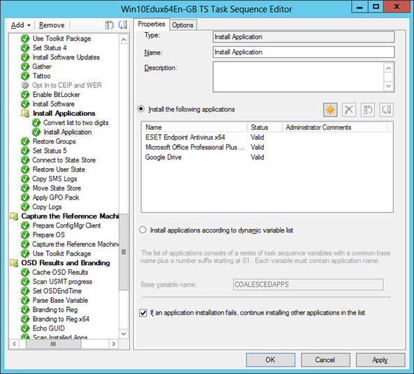 To make your applications available for OSD Task Sequence, application should be created for System and Logon requirement should be “Whether or not user is logged on” and distribute the apps to DPs.