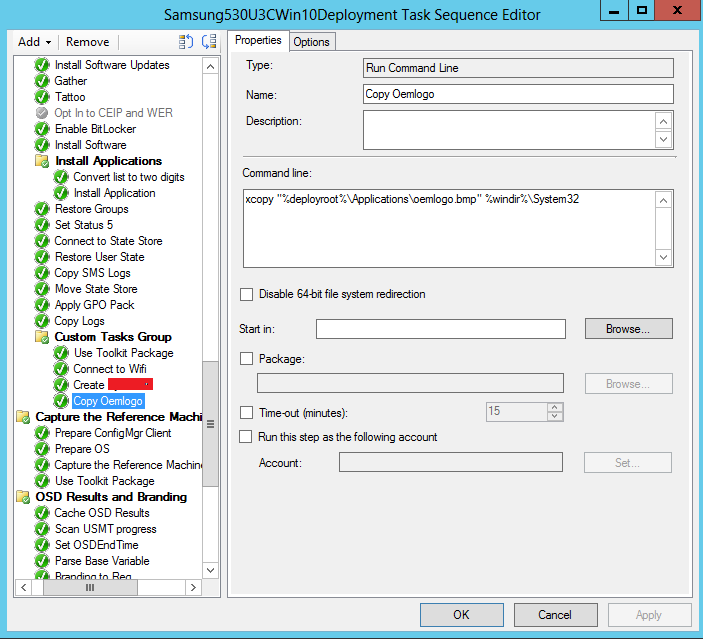 Then, Add a “Run command line” task step to the Task Sequence under Custom Task Group.