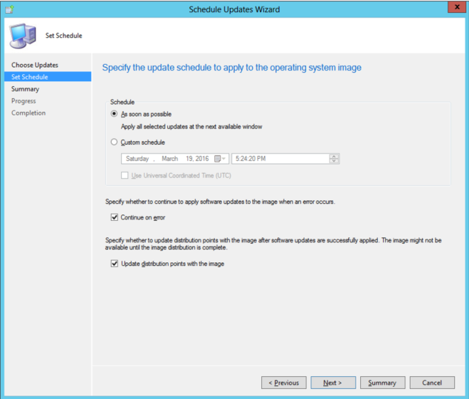 Schedule it As soon As possible, tick to continue on error and Select Update DPs with the image, so it will update the image on DPs. Complete the rest of the wizard.