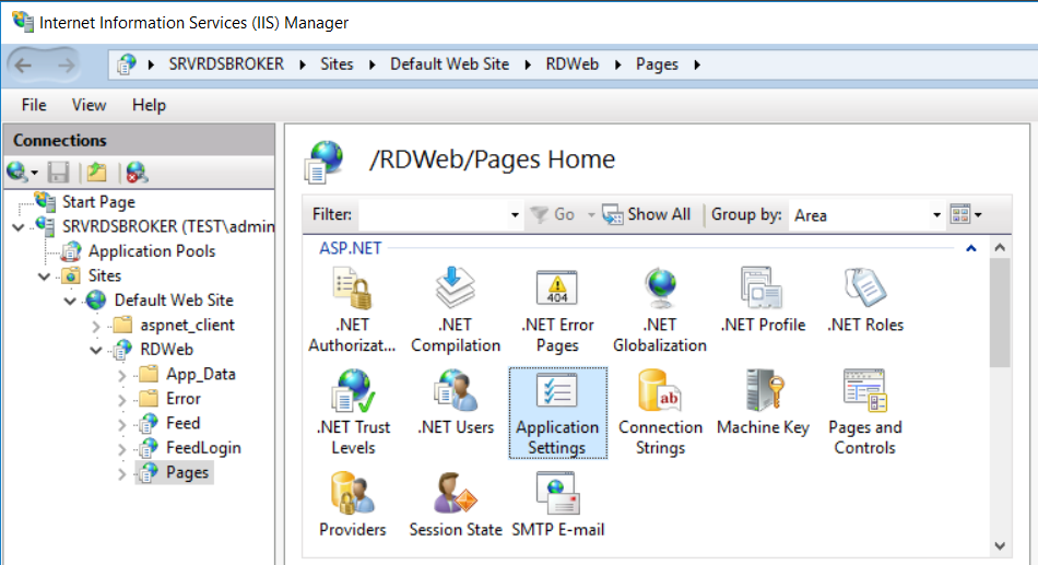 Logon to Web Access Server > Start IIS > Sites > Default Web Site > RD Web > Pages > Open Application Settings